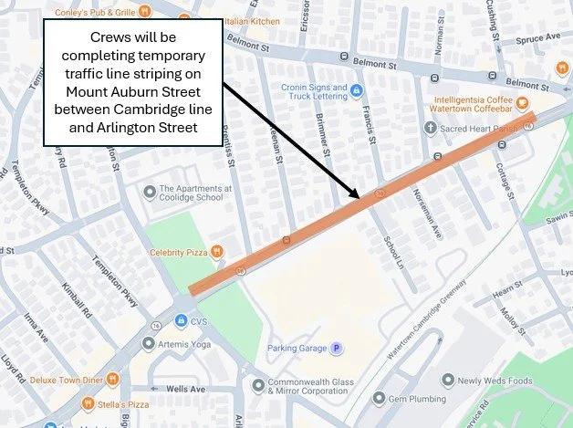 During this work, you can expect temporary lane shifts and possibly lane closures, but one travel lane in each direction will be maintained on Mount Auburn Street. Work will take place on the sidewalks, but they will remain open and accessible. Business entrances will be maintained as well. Work in these areas will begin at 7:00 am each day and end before 5:00 pm.