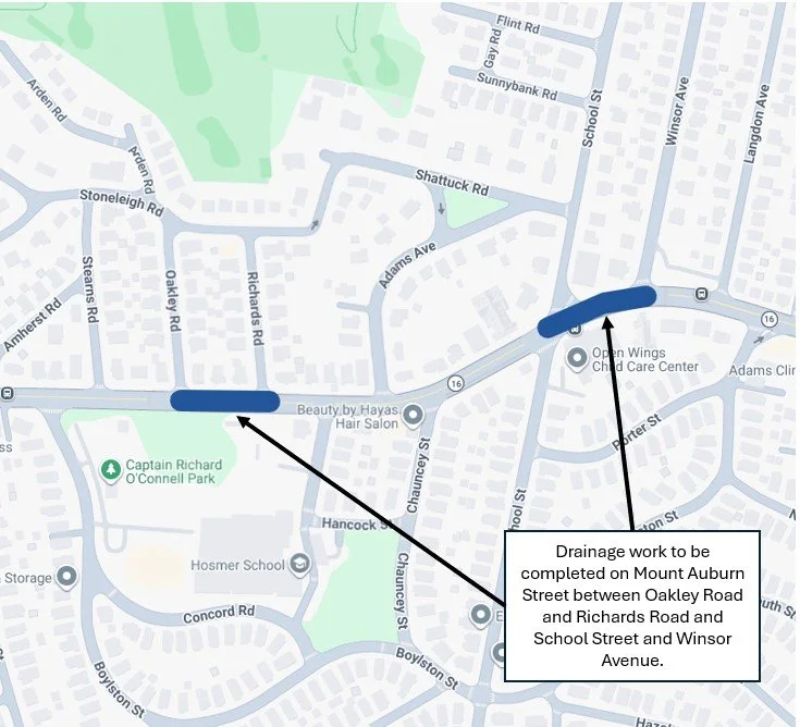 Crews will continue drainage installation and excavate test pits on Mount Auburn Street between Richards Road and Oakley Road and Winsor Avenue and School Street