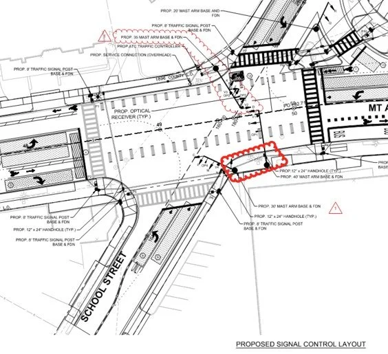 Electrical contractors will be installing mast arm foundations at the intersection of Mount Auburn Street at School Street and Boylston Street. Mast arm foundations are the base of traffic signals.