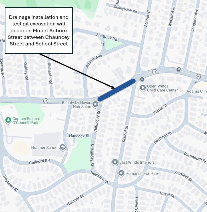 Crews will continue drainage installation and excavate test pits on Mount Auburn Street between Chauncey Street and School Street