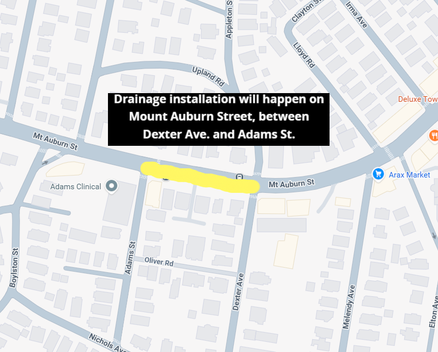 Crews will continue drainage installation between Dexter Avenue and Adams Street next week on Mount Auburn Street.