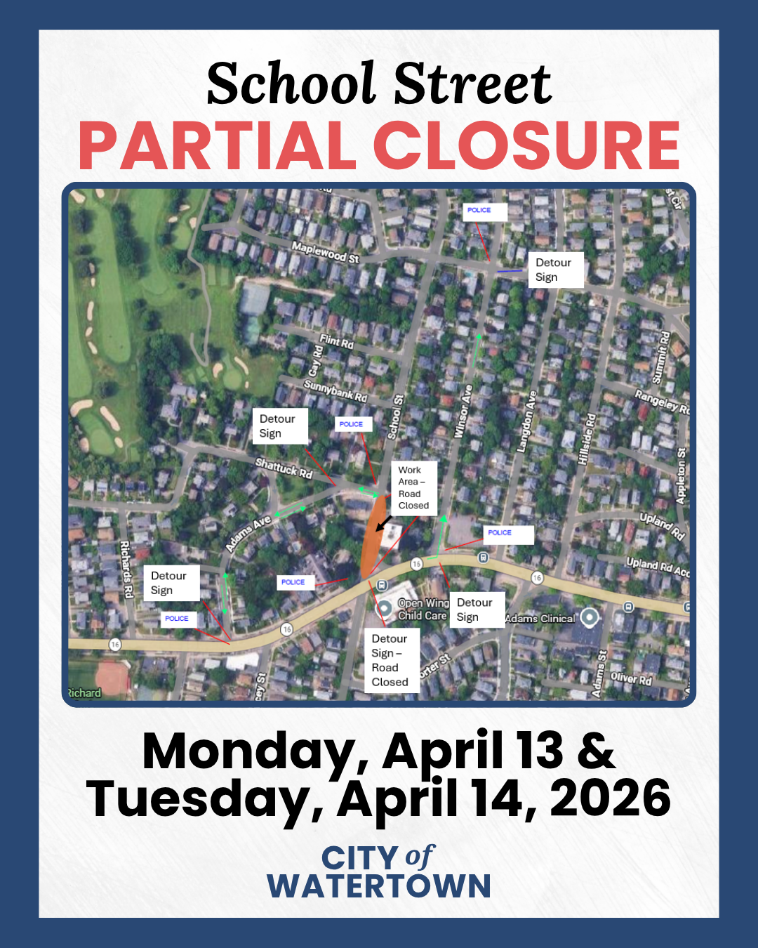 Continuing April 13 and 14, 2026, a detour will be in place on School Street.
